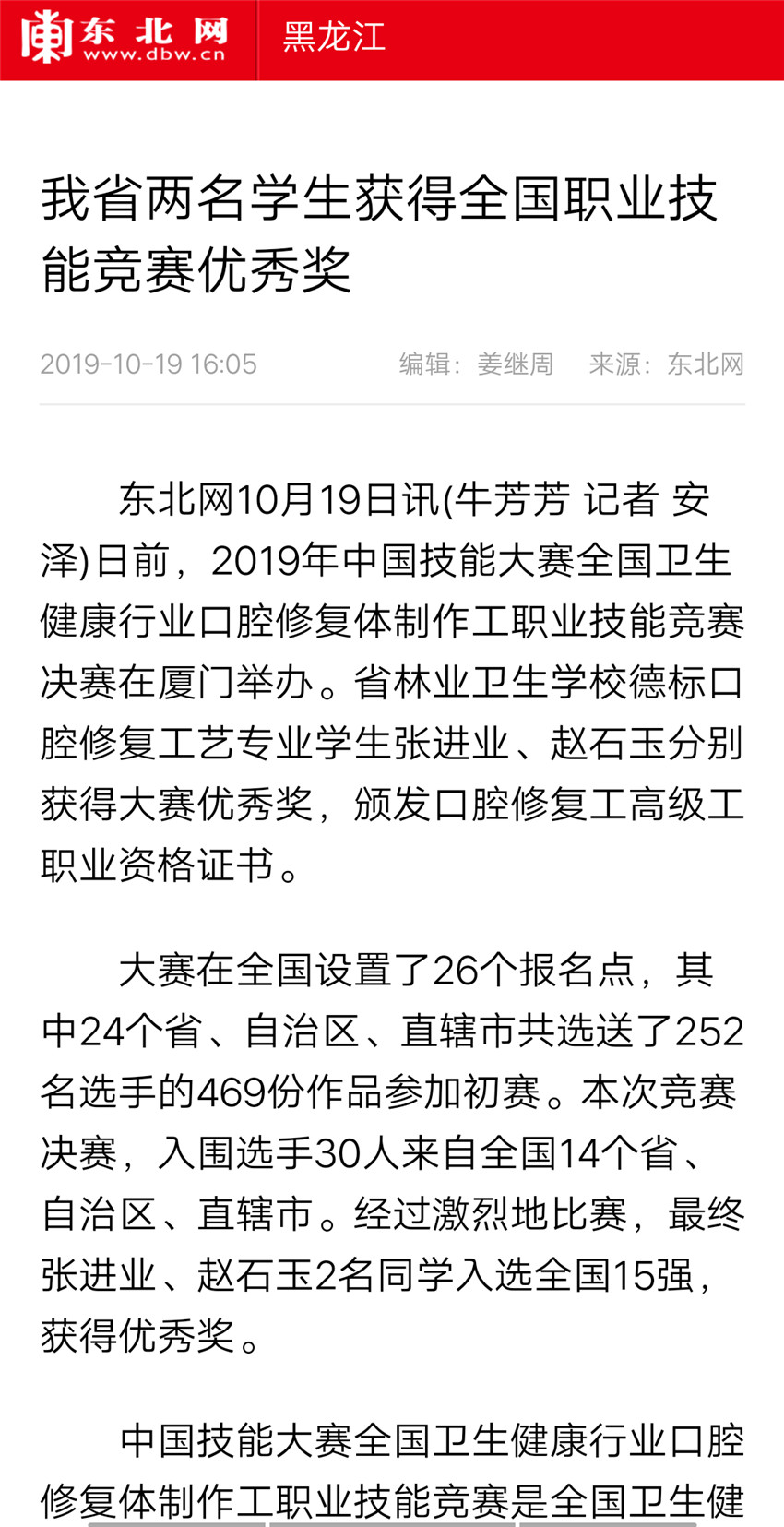 【东北网】我省两名学生获得全国职业技能竞赛优秀奖