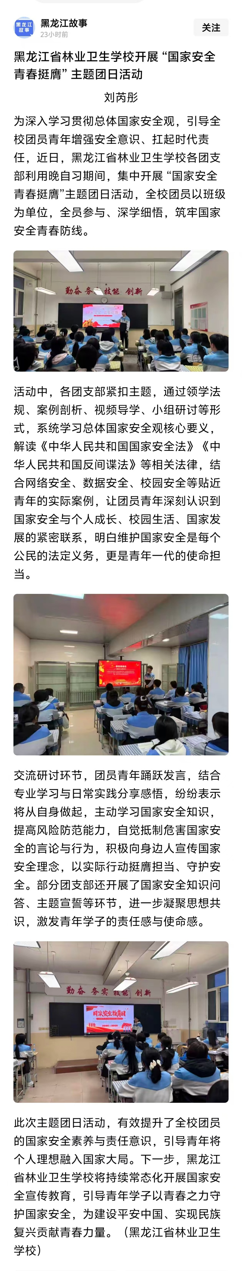 【今日头条】黑龙江省林业卫生学校开展“国家安全青春挺膺”主题团日活动