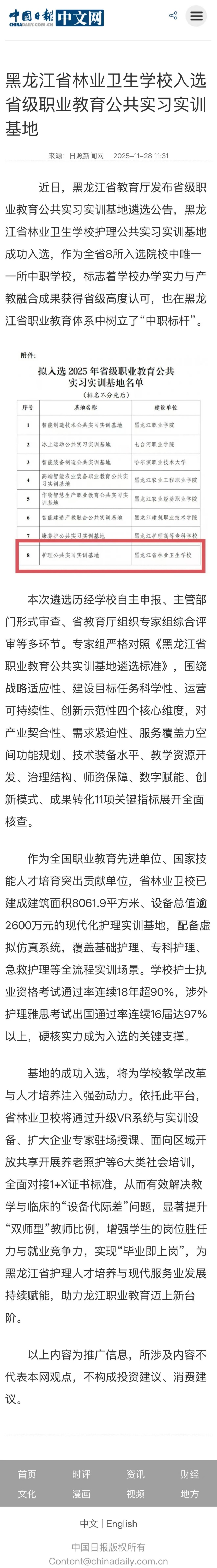 【中国日报】黑龙江省林业卫生学校入选省级职业教育公共实习实训基地