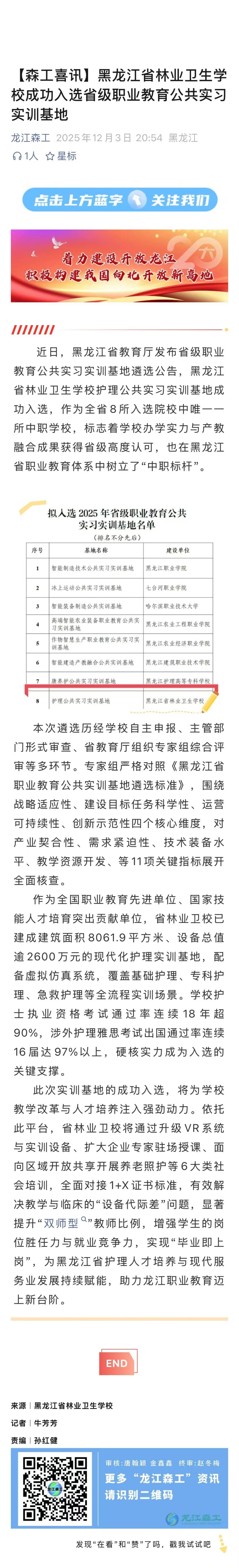 【龙江森工】【森工喜讯】黑龙江省林业卫生学校成功入选省级职业教育公共实习实训基地