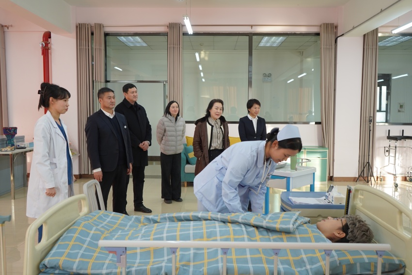 随后,杨晶主席一行在学校领导陪同下,实地考察了德标项目各专业实训基地、护理与康复技术实训中心。调研中,杨晶主席详细询问了实训设施建设、课程设置与行业需求衔接、校企人才培养等情况,对我校立足林区卫生行业、服务林区民生需求的办学特色,以及在产教融合、人才培养方面取得的成果表示高度认可,认为学校办学定位精准,为龙江森工发展和地方民生保障作出了积极贡献。