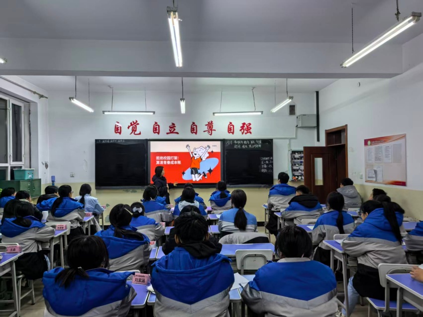 “拒绝校园打架,算清青春成本账”主题班会上,通过真实案例复盘、法律责任解读、成长代价梳理等形式,让学生直观认识校园打架对个人学业、身心健康、家庭幸福及未来职业发展的多重负面影响,明确暴力行为背后的法律后果与道德代价,引导学生理性处理矛盾,学会用沟通、求助等合法途径解决问题。