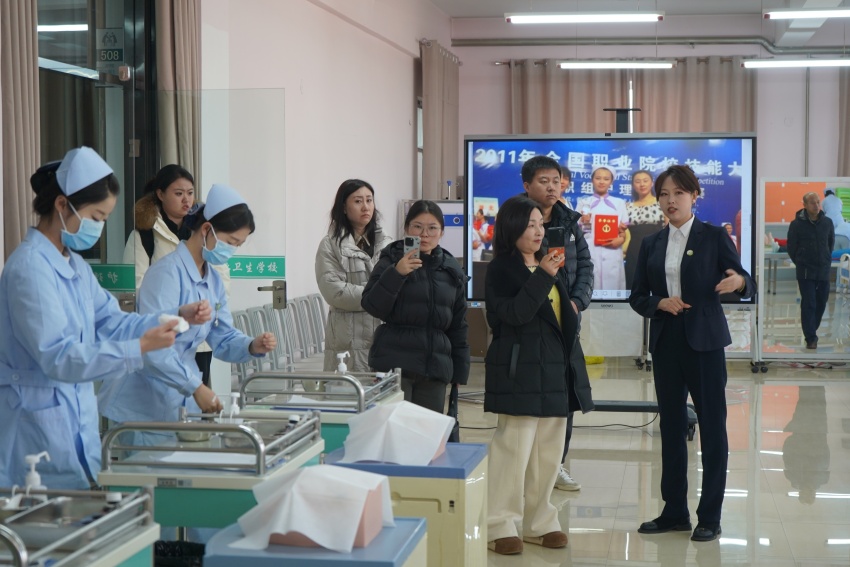 10月27日至28日期间,考察团教师深入我校第二教学楼各班级,与班主任一同走进课堂,观摩日常教学全过程,详细了解课堂管理、教学设计、师生互动等方面的实践经验;教师们前往护理技能大赛训练现场,近距离观摩学生技能训练情况,与指导教师交流赛前训练方案、技能提升技巧等核心问题,对我校以赛促学、以赛促练的人才培养模式给予高度评价。交流过程中,双方教师面对面沟通,全方位、多角度汲取办学治校、教学管理、技能培养等方面的实践经验。