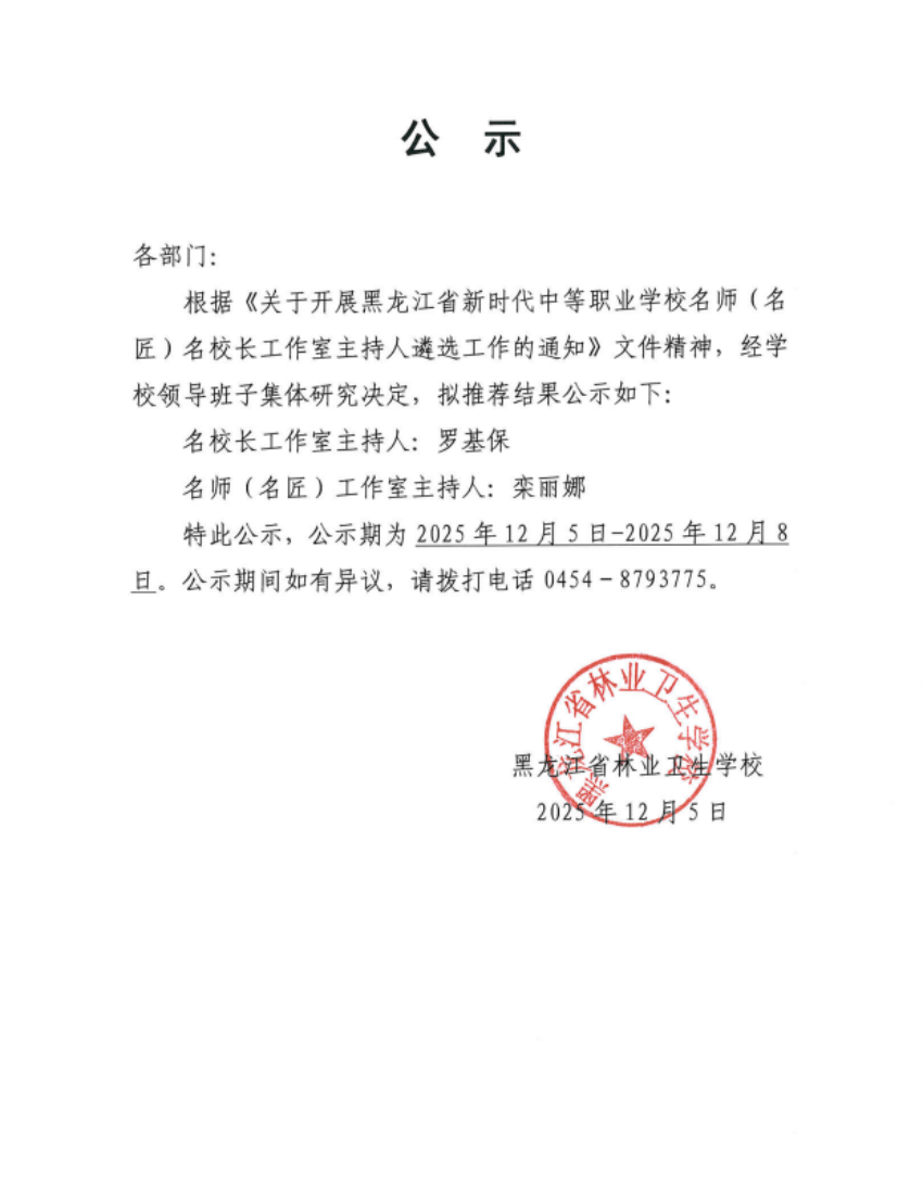 根据《关于开展黑龙江省新时代中等职业学校名师(名匠)名校长工作室主持人遴选工作的通知》文件精神,经学校领导班子集体研究决定,拟推荐结果公示如下: