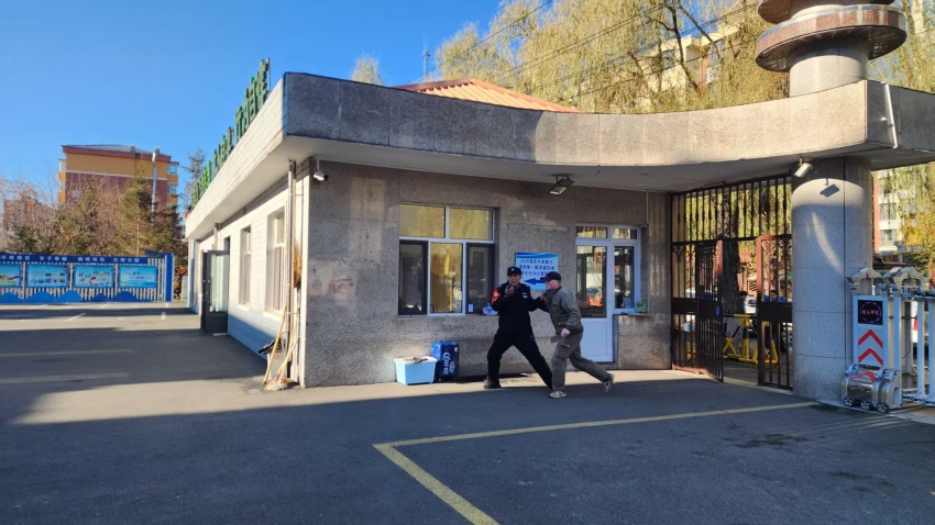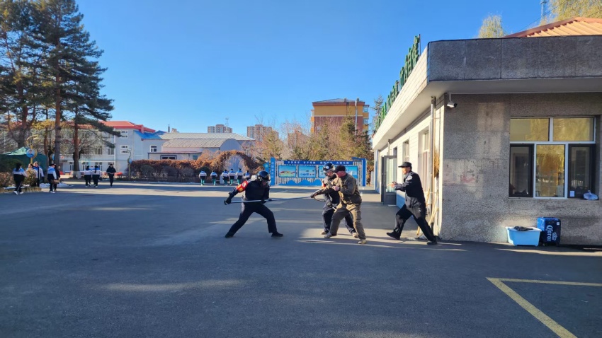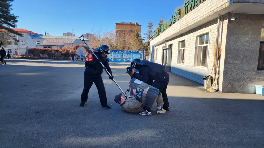 演练模拟场景为一名“持刀暴徒”突然闯入校门口,此时正值课间,部分学生在操场活动。现场值班教师发现险情后,立即大声发出预警信号,同学们听从指挥、沉着配合,在教师引导下快速远离危险区域,整个撤离过程紧张有序,不慌不乱。校门口安保人员第一时间启动应急响应,手持防暴盾牌、钢叉等器械冲向现场,与“暴徒”形成对峙并实施阻拦。随后,学校应急小分队成员迅速增援,与安保人员协同作战,运用专业防暴战术形成合围,果断出击,成功将“暴徒”制服,彻底消除现场危险。
