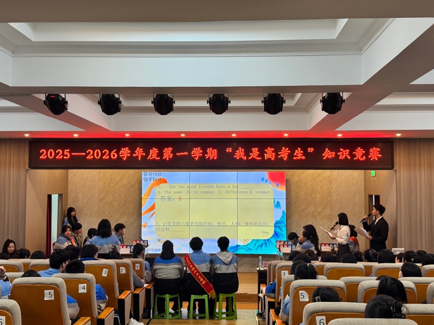 12月17日下午,我校第八届“我是高考生”知识竞赛在主校多功能厅举办。部门领导、相关任课教师、班主任及职教高考升学专业150名学生观看比赛。