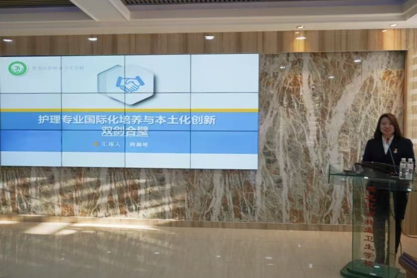 随后,双方在实训楼会议室召开交流座谈会。我校重点介绍了办学理念、专业布局及发展成效。国际教育部就护理专业的国际化;对口升学的专业拓展;以及教学能力大赛的夺冠三个角度进行护理专业国际化培养与本土化创新的双剑合璧的经验分享。来访团对我校在职业教育改革、产教融合及国际化办学方面的探索表示赞赏,来访代表表示,我校底蕴深厚、师资优良、管理先进,教职工勤奋敬业、甘于奉献的精神令人敬佩,值得深入学习借鉴,并诚挚邀请我校团队前往通州指导教学、引领发展。